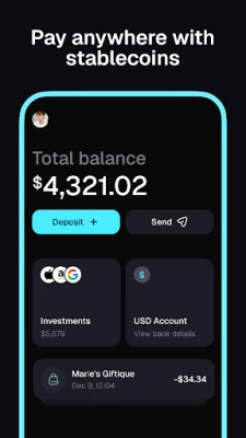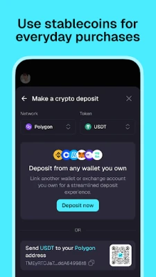 Pay online or in-store with virtual and physical cards linked to your USDC or USDT balance.